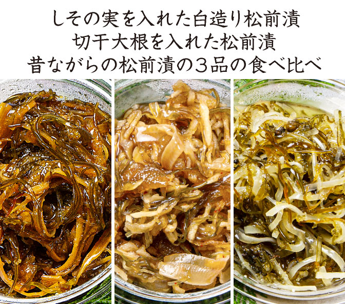 しその実を入れた白造り松前漬 切干大根を入れた松前漬昔ながらの松前漬の3品の食べ比べ