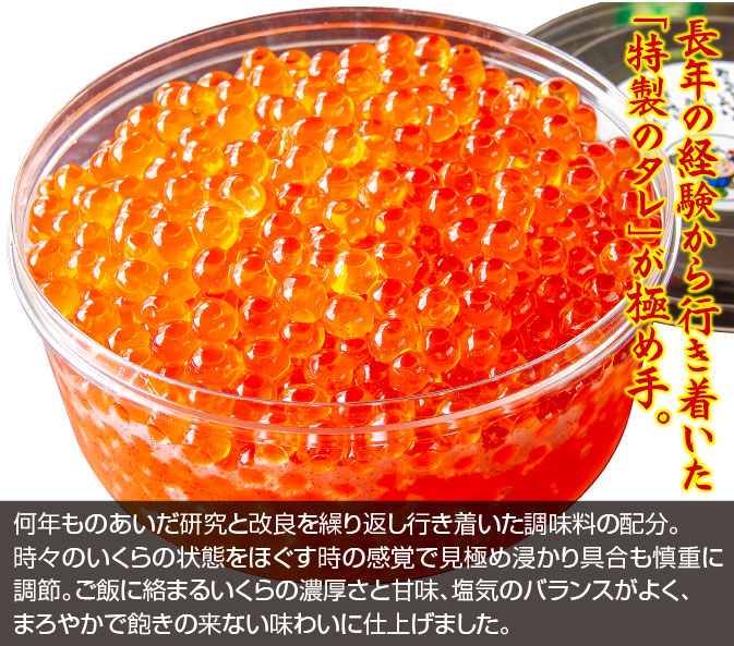 いくらの粒は北海道産、ロシア共に大粒鮭いくらを使用しています。ロシアの漁獲は北海道産よりは少し多くの漁が有った為若干の安価と
