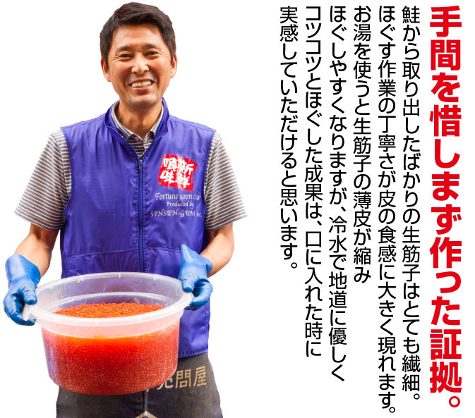 鮭から取り出したばかりの生筋子はとても繊細。ほぐす作業の丁寧さが皮の食感に大きく現れます。お湯を使うと生筋子の薄皮が縮みほぐしやすくなりますが、冷水で地道に優しくコツコツとほぐした成果は、口に入れた時に実感していただけると思います。