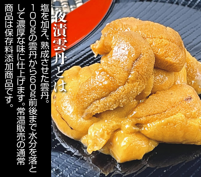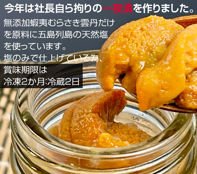 無添加の蝦夷雲丹だけを原料に五島列島の天然塩を使っています。塩のみで仕上げている為、