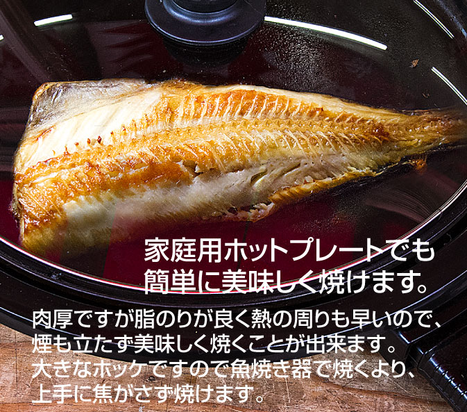家庭用ホットプレートでも簡単に美味しく焼けます。 肉厚ですが脂のりが良く熱の周りも早いので、煙も立たず美味しく焼くことが出来ます。大きなホッケですので魚焼き器で焼くより、上手に焦がさず焼けます。