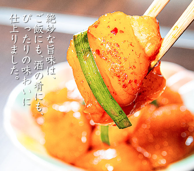 北海道産の刺身にする貝柱を使って特製ブレンドの甘辛タレに漬け込んだ絶妙な旨辛味は、ご飯にも、酒の肴にも、ぴったりの味わいに仕上がっています。